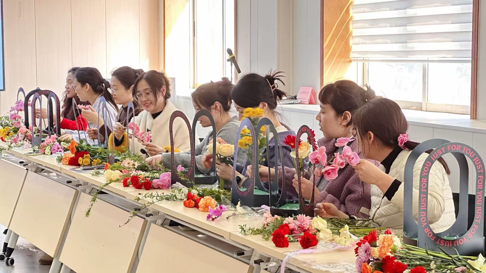 活动现场花香氤氲、暖意融融,营造出浪漫雅致的春日氛围。活动特邀专业花艺老师现场授课,围绕花材认知、花语寓意、色彩搭配、修剪技巧与造型构图进行细致讲解,现场演示插花要点,手把手指导大家将零散花材组合成层次丰富、错落有致的花艺作品。