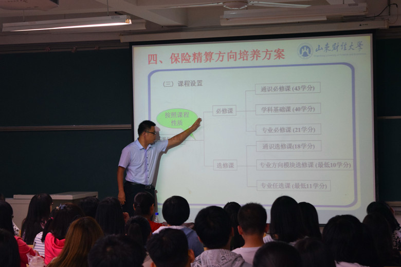 2015级新生专业教育在圣井校区举行,院长助理于文广副教授、保险教研室主任孙秀清教授、教学秘书吕萍老师出席并担任主讲,专业教育会由团委书记陶晓华主持。