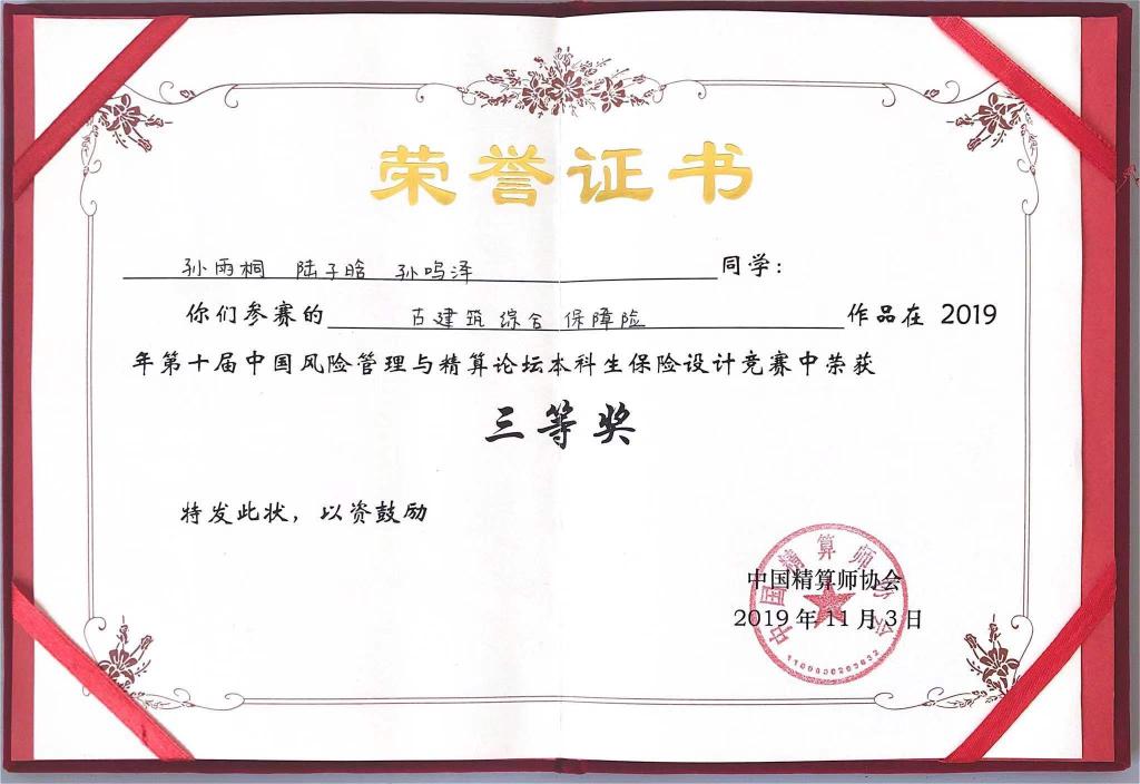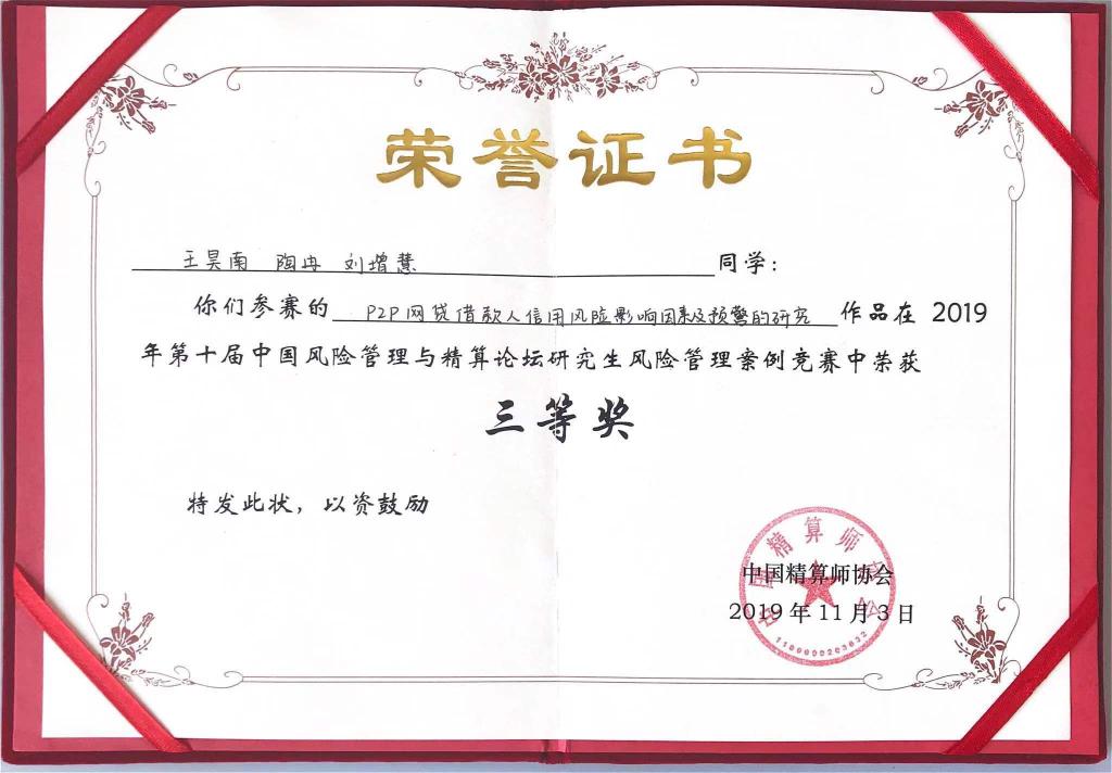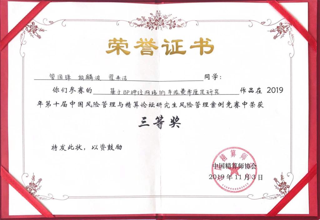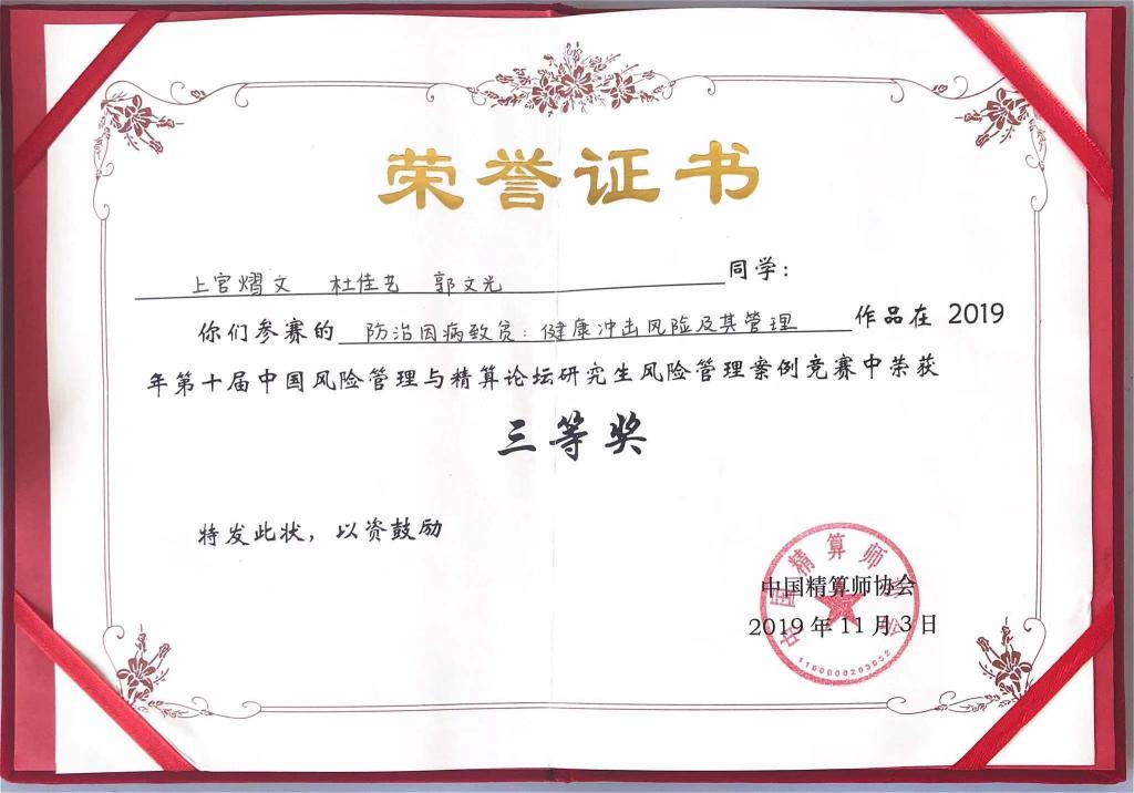 通过精心有序的作品展示和紧张激烈的答辩,最终杏吧视频 三支本科生团队和三支研究生团队分别在全国30支本科生参赛团队和20支研究生参赛团队中脱颖而出。本科生三支团队分别获得一二三等奖,研究生三支团队均获得了三等奖,获奖整体情况名列前茅。本科生竞赛方面,李泽鑫、卢舒、宋雅姝的参赛作品《UBI模式下的新型共享汽车综合险》(指导老师:于文广)在本科生竞赛中荣获一等奖,张程荷、谭轶丰、李冰的参赛作品《新型骑手意外综合险》(指导老师:于文广)在本科生竞赛中荣获二等奖,孙雨桐、陆子晗、孙鸣泽的参赛作品《古建筑综合保障险》(指导老师:于新亮)在本科生竞赛中荣获三等奖。研究生竞赛方面,管国锋、熊麟波和翟来洁的参赛作品《基于BP神经网络的车险费率厘定研究》(指导老师:于文广),王昊南、陶冉、刘增慧的参赛作品《P2P网贷借款人信用风险影响因素及预警的研究》(指导老师:丁德臣),上官熠文、杜佳艺、郭文光的参赛作品《防治因病致贫:健康冲击风险及其管理》(指导老师:于新亮)在研究生竞赛中荣获三等奖。