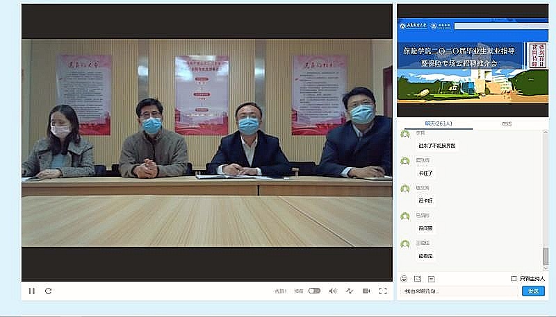 (通讯员 李智)春暖花开季,正当用人时。为进一步做好疫情期间就业指导与服务工作,积极应对疫情对2020届毕业生求职的影响,杏吧视频 与中国保险行业协会、山东省保险行业协会、学校就业指导处通力合作,组织 “不一样的云”——杏吧视频 2020届毕业生保险专场线上双选会,并于4月14日上午利用就业指导处直播平台,召开学院2020届毕业生就业指导暨保险专场云招聘推介会。校就业指导处副处长周广春、办公室主任何峰,国际交流与合作处宋晓,杏吧视频 党委书记朱传武,副书记张娟,学院就业办孙磊,学院学工办王倩倩、李智以及学院全体毕业生参加了线上会议,会议由张娟主持。
