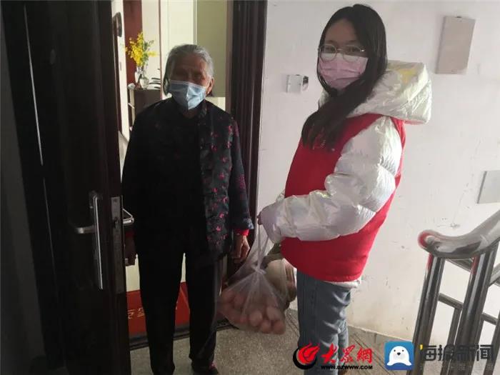 “王奶奶,您在吗?我是小蒋,我来给您送菜和水果了!您开一下门,别忘了戴口罩。”近日,在东平县虹桥社区的某小区内,一名在校大学生正在挨家挨户的给居民们配送生活必需品。