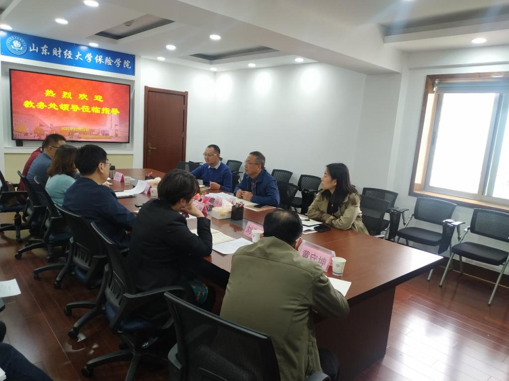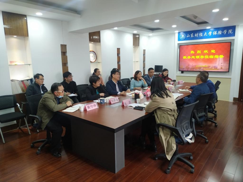 2021年10月29日,教务处陈保启处长、许滋坤副处长、张莉科长一行到杏吧视频 调研。调研座谈会在学院会议室举行,葛永波院长、张娟副书记、刘素春副院长、于文广副院长以及系主任黄守坤、杜鹃、副主任付红、于新亮和教学秘书吕萍参加了座谈会。