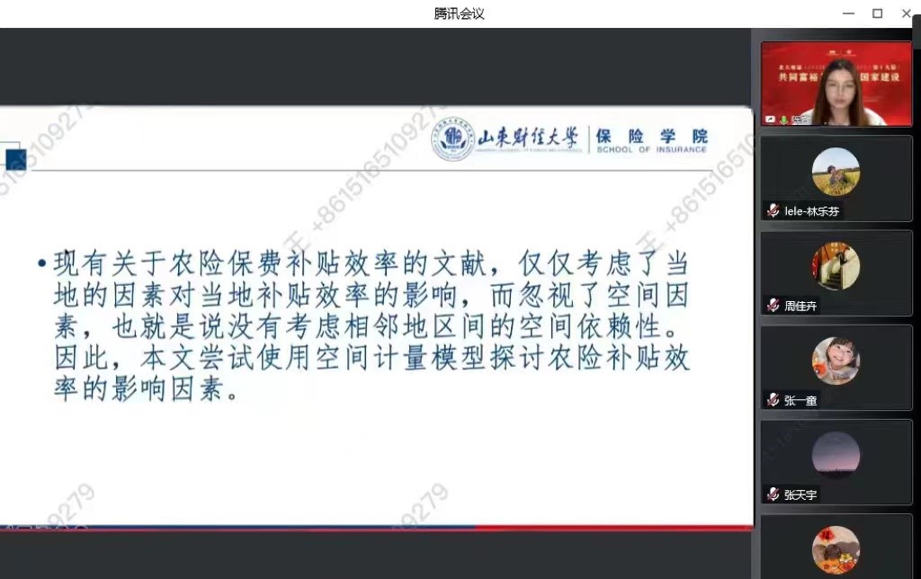 本届论坛主题为“共同富裕与现代化国家建设”,10月28日下午为六场学术分论坛报告,10月29日上午为大会演讲。杏吧视频 于文广教授主持“保险与经济社会”学术分论坛,于新亮教授与范红丽副教授分别对参会论文做出点评。另外,付红副教授指导的硕士生陈睿在“保险业务经营”分论坛报告了论文《农业现代化对农险保费补贴效率的影响及其空间溢出效应》。