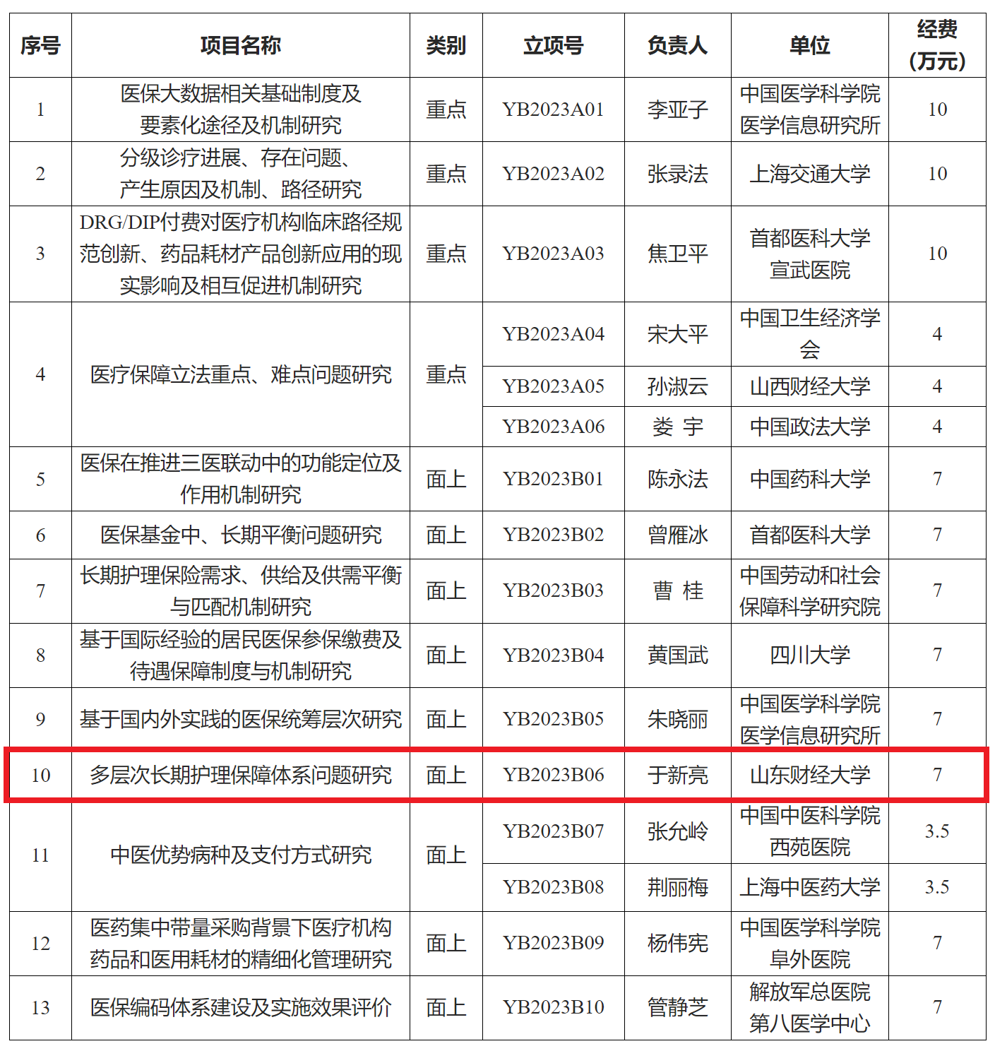 经过形式审核、技术评审、院务会审定等环节,首都医科大学国家医疗保障研究院于近日公布2023年度开放性课题立项名单,共资助4个重点课题、9个面上课题,杏吧视频 于新亮教授及其团队申报项目“多层次长期护理保障体系问题研究”获得面上课题立项。