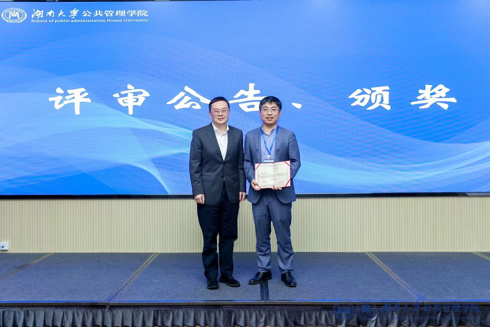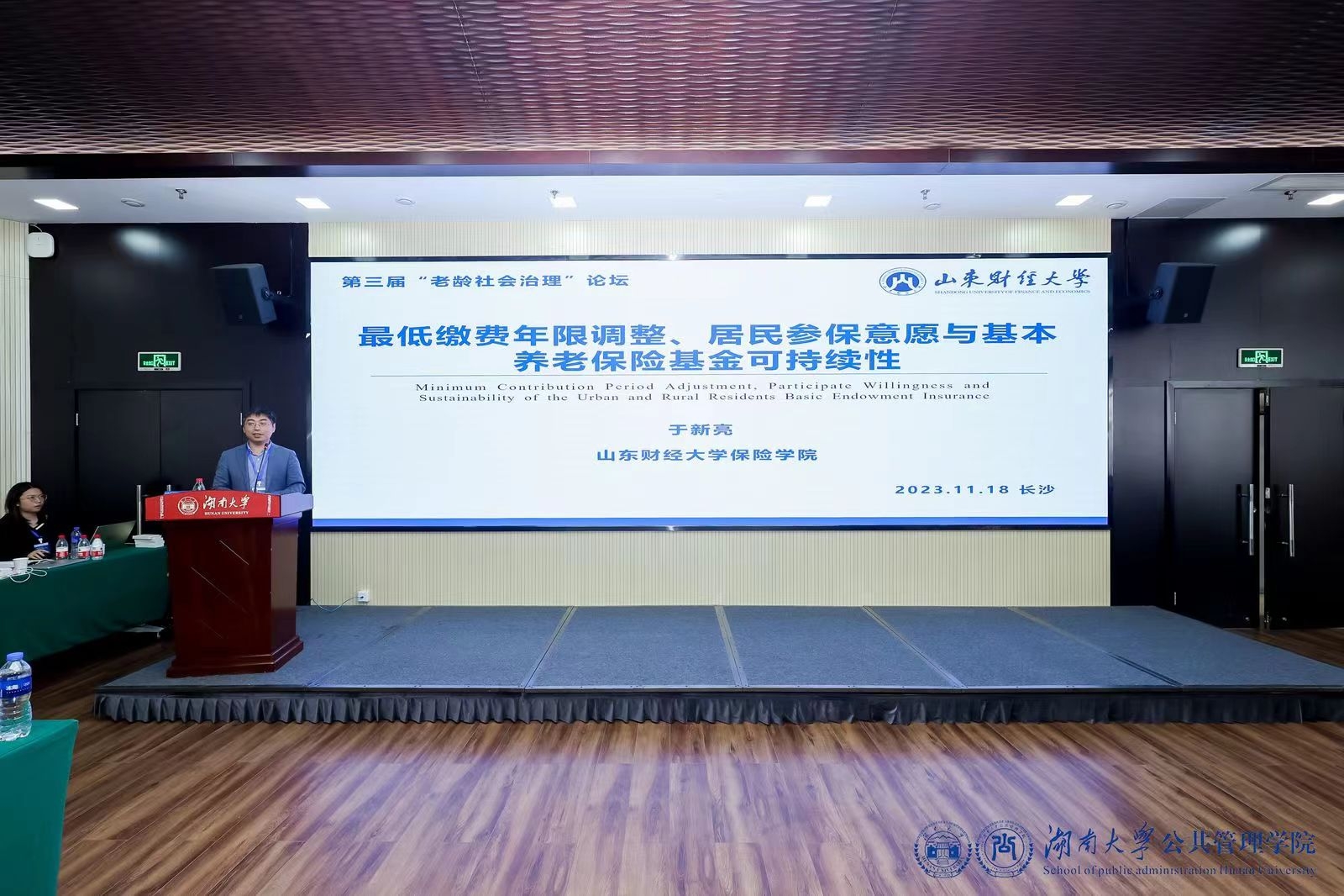 本届论坛以“主旨演讲+分论坛”的形式进行。会议开幕式上,湖南大学公共管理学院院长李连友为参会论文颁奖。本次论坛共200余篇论文参评,经过初筛、学院初审和专家外审,评出优秀论文三等奖3名,二等奖2名,一等奖1名,而于新亮教授及其指导的研究生任丽颖撰写的论文《最低缴费年限调整、居民参保意愿与基本养老保险基金可持续性》获得一等奖。主旨报告环节,于新亮教授以“最低缴费年限调整、居民参保意愿与基本养老保险基金可持续性”做主旨报告。