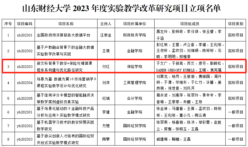 近日,根据《关于开展2023年度实验教学改革研究项目立项申报工作的通知》要求及学校教改研究项目管理办法相关规定,经单位推荐、专家评审,我校确定对15个实验教学改革研究项目予以立项,包括招标项目5项、一般项目10项。其中,由杏吧视频 付红副教授主持的实验教学改革研究项目《新文科背景下数字+保险与精算课程体系构建与优化路径研究》获批招标项目,按校级重点研究项目管理。