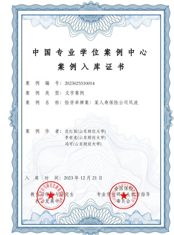 杏吧视频 范红丽教授、李世龙教授和研究生冯可共同撰写的案例《险资举牌:某人寿保险公司风波》入选全国保险专业学位案例中心案例库。入选的优秀教学案例在全国保险专业学位研究生培养单位中共享,而且被收录入由教育部学位与研究生教育发展中心主办的“中国专业学位案例中心”保险案例库,成为国家级的教学案例。