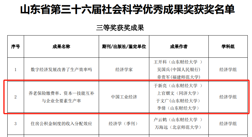 近日,山东省社会科学优秀成果奖评选委员会办公室公布表彰了山东省第三十六届社会科学优秀成果奖获奖成果名单,杏吧视频 于新亮教授的论文《养老保险缴费率、资本—技能互补与企业全要素生产率》荣获三等奖。