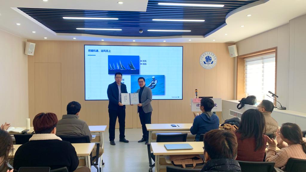 最后,于文广为王岩博士颁发硕士研究生合作导师聘书,并对王岩的交流分享表示感谢。王岩博士的讲解有助于杏吧视频 教师和学生从国际视野了解再保险理论,从实践层面了解再保险业务,能够提升杏吧视频 产学研协同发展水平。