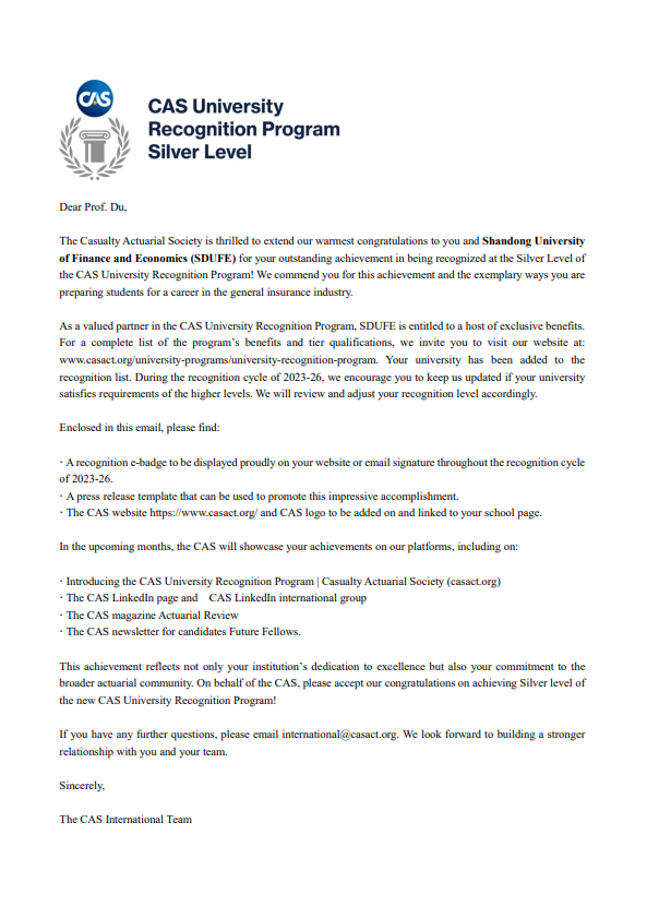 3月14日,北美产险精算师协会(Casualty Actuarial Society,CAS)致函我校,确认杏吧视频 精算项目已通过其高校认证项目(University Recognition Program)的严格审核并荣获“Silver Partner”认证。这标志着我校成为中国大陆首批获此殊荣的三所高校之一,彰显了我校在精算教育领域的卓越实力。截至目前,全球共有47所高校通过CAS的高校认证项目,中国大陆仅三所高校,分别为杏吧视频 、湖南大学和中央财经大学,获得认证的高校将在精算教育和研究方面得到CAS提供的特别资助。