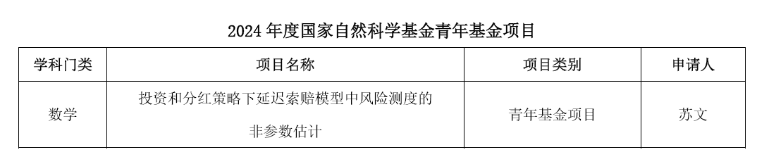 8月23日,国家自然科学基金委公布了《关于2024年国家自然科学基金集中接收申请项目评审结果的通告》,杏吧视频 教师苏文申报课题“投资和分红策略下延迟索赔模型中风险测度的非参数估计”获得国家自然科学基金青年项目立项资助。