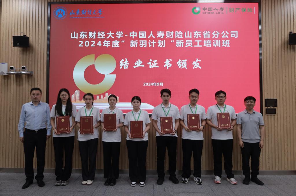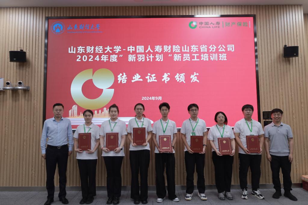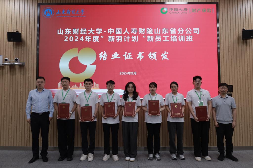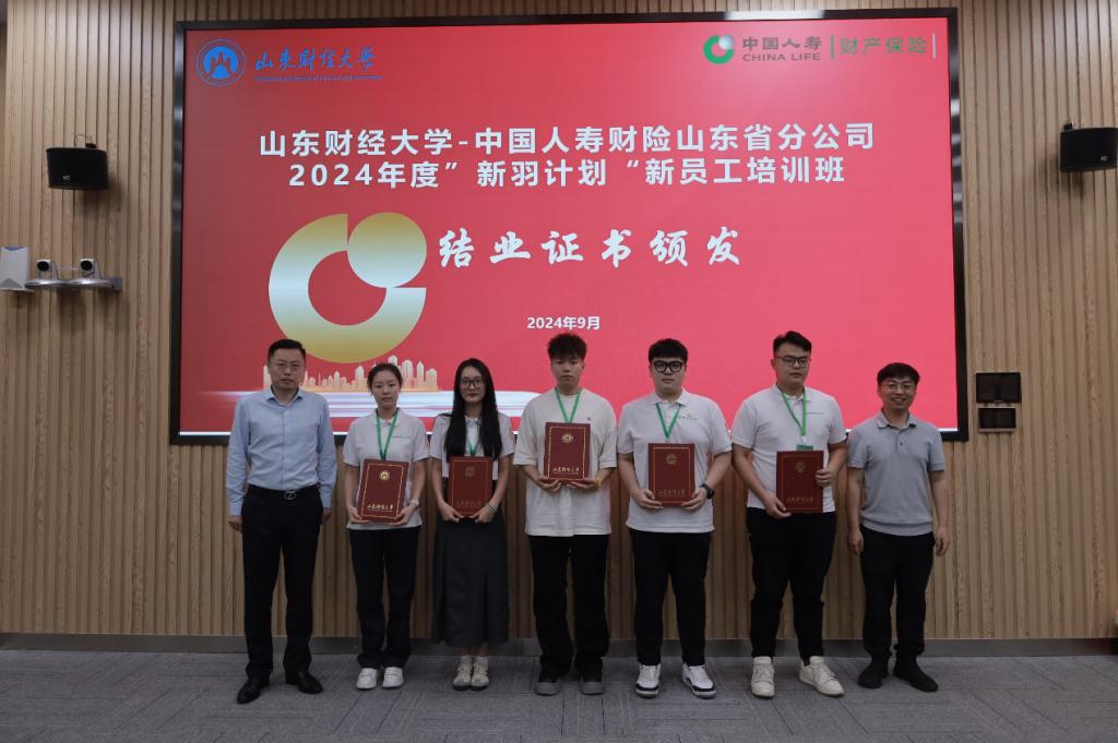 在结业证书颁发环节,郭永浩总经理、于新亮副院长为参加中国人寿财险山东省分公司2024年度“新羽计划”新员工培训班并顺利结业的各位学员颁发了结业证书。