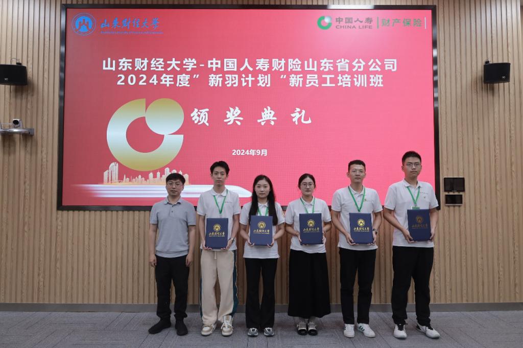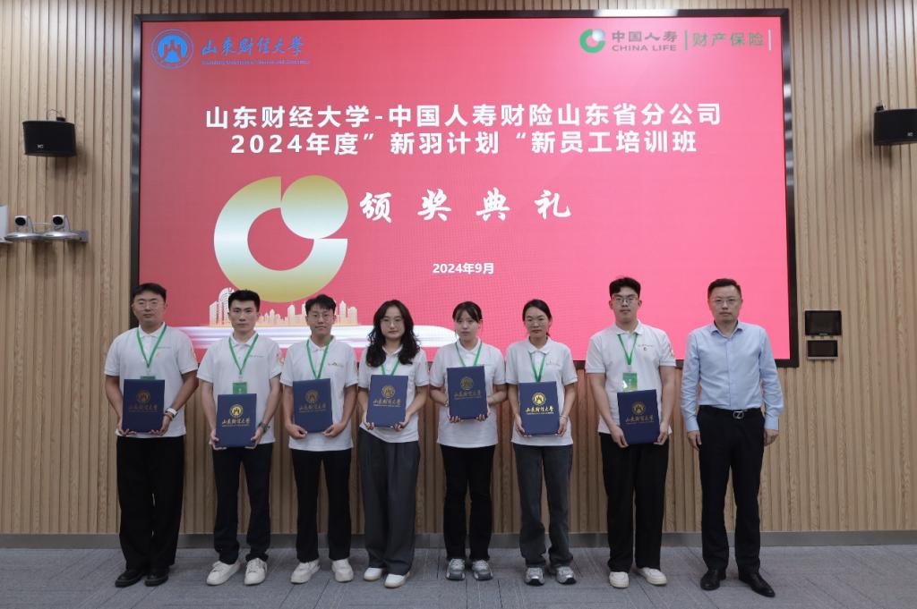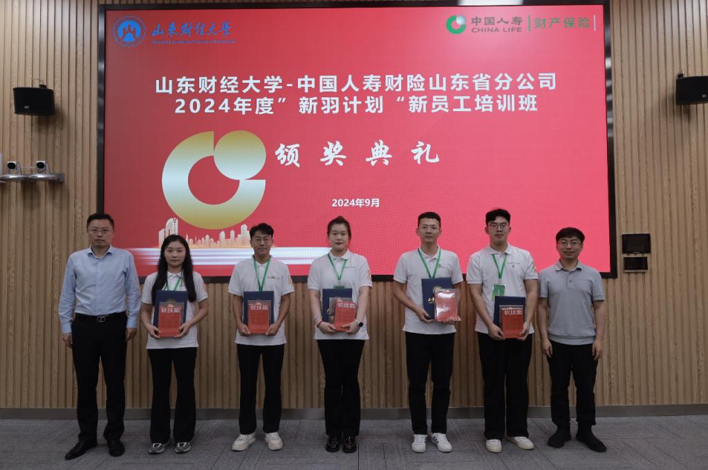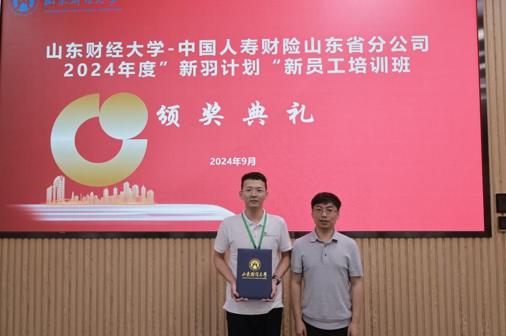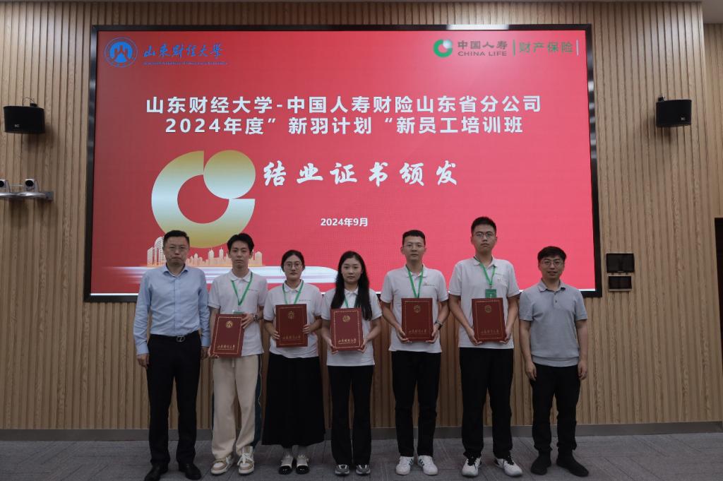 在结业证书颁发环节,郭永浩总经理、于新亮副院长为参加中国人寿财险山东省分公司2024年度“新羽计划”新员工培训班并顺利结业的各位学员颁发了结业证书。