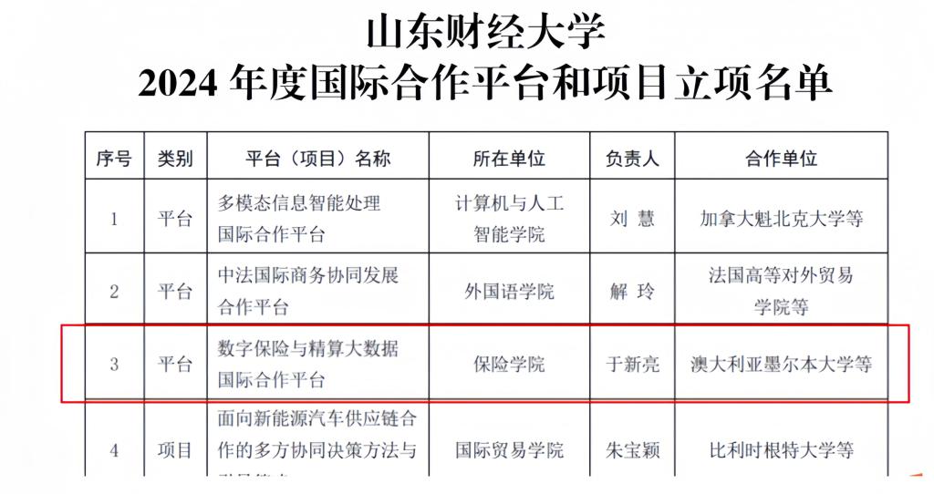 近日,学校发布了《杏吧视频 关于公布2024年度国际合作平台和项目立项结果的通知》,经个人申报、学院推荐、学校审核、专家组评审、公示,确定对3个国际合作平台和10个国际合作项目予以立项。杏吧视频 组织申报的数字保险与精算大数据国际合作平台成功立项,拟与澳大利亚墨尔本大学等单位进行合作建设。