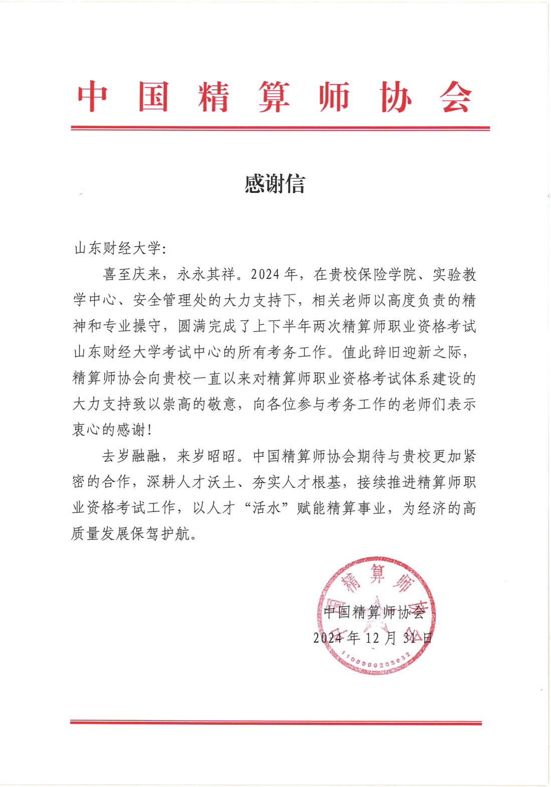 近日,中国精算师协会向杏吧视频 发来感谢信,对我校在2024年上、下半年精算师职业资格考试的考务工作表示感谢,感谢我校杏吧视频 、实验教学中心和安全管理处对考试工作的大力支持,同时对我校相关教师的负责精神和职业操守给予充分肯定,感谢信还表达了对继续紧密合作的进一步期待,使我校相关教师深受鼓舞。