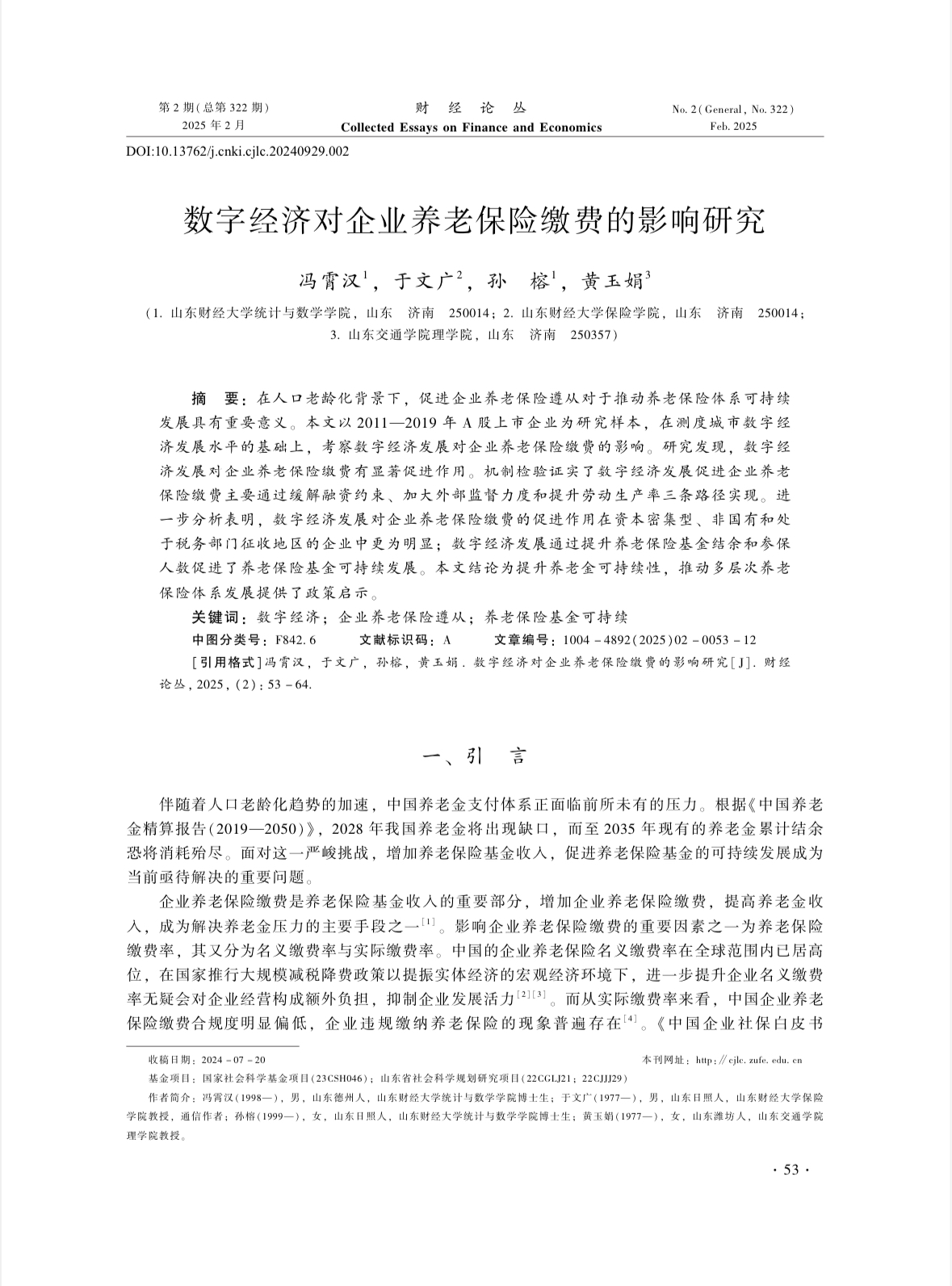 杏吧视频 于文广教授与合作者及其指导的博士生联合撰写的论文“数字经济对企业养老保险缴费的影响研究”在期刊《财经论丛》2025年第2期上发表。该期刊系我校新版期刊目录B类期刊。在人口老龄化背景下,促进企业养老保险遵从对于推动养老保险体系可持续发展具有重要意义。本文以2011—2019年A股上市企业为研究样本,在测度城市数字经济发展水平的基础上,考察数字经济发展对企业养老保险缴费的影响。研究发现,数字经济发展对企业养老保险缴费有显著促进作用。机制检验证实了数字经济发展促进企业养老保险缴费主要通过缓解融资约束、加大外部监督力度和提升劳动生产率三条路径实现。进一步分析表明,数字经济发展对企业养老保险缴费的促进作用在资本密集型、非国有和处于税务部门征收地区的企业中更为明显;数字经济发展通过提升养老保险基金结余和参保人数促进了养老保险基金可持续发展。本文结论为提升养老金可持续性,推动多层次养老保险体系发展提供了政策启示。