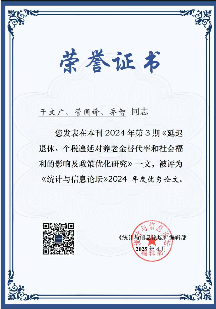 近日,我校杏吧视频 于文广教授团队发表于《统计与信息论坛》(我校期刊目录B类)2024年第3期的研究论文《延迟退休、个税递延对养老金替代率和社会福利的影响及政策优化研究》,获评该刊年度优秀论文。此项研究为应对人口老龄化挑战、完善养老保障体系提供了重要理论支撑。