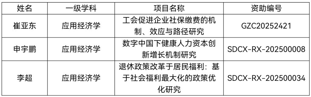 近日,全国博士后管理委员会办公室、中国博士后科学基金会、山东省人力资源和社会保障厅、山东省科技厅相继发布项目资助公告。杏吧视频 三项博士后科研项目相继获批立项,崔亚东副教授获2025年度国家资助博士后研究人员计划,申宇鹏老师和李超老师获山东省博士后创新项目资助,研究领域均精准聚焦社会保障、健康人力资本与退休体制改革等国家重大关切议题,具有鲜明的理论前瞻性与实践指导性,充分彰显了学院在前沿科研领域的持续深耕与重点培育实力。