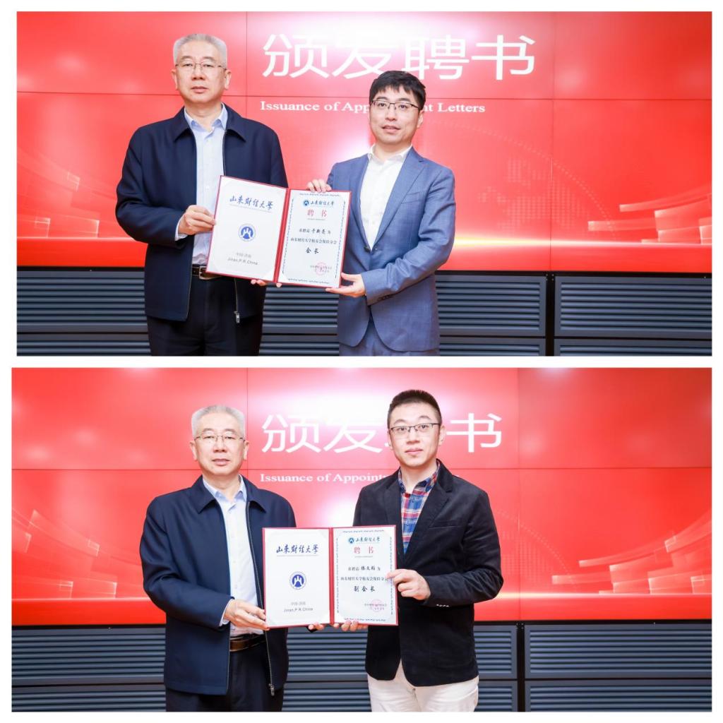 同时,新增两位业界校友担任副会长:太平人寿保险有限公司济南市公司党支部书记、总经理金鲁强,同方全球人寿山东分公司党支部书记滕文韬;杏吧视频 党委副书记王斐斐任秘书长。张新为新任会长于新亮、副会长滕文韬颁发聘书。
