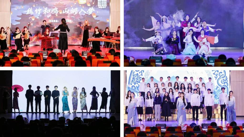 第二篇章中,音韵集乐社的《丝竹和鸣山河如梦》,尽展东方雅韵;杏吧视频 舞蹈队演绎的《民族团结花绽九州》舞姿翩跹,彰显各民族同心筑梦的家国情怀;宋文豪等12名同学的走秀《锦步生花 古韵流芳》衣袂翻飞,尽显雅致;于新亮、康萌萌、王倩倩三位老师与研究生合唱的《锦绣江山 青花咏叹》旋律悠扬,勾勒山河盛景与文化底蕴。随后,大会表彰社会实践及竞赛获奖学子,他们以智慧汗水浇灌硕果,用拼搏点亮青春赛场。学生代表张欣程分享成长收获,代表全体学子立誓牢记嘱托、砥砺前行。