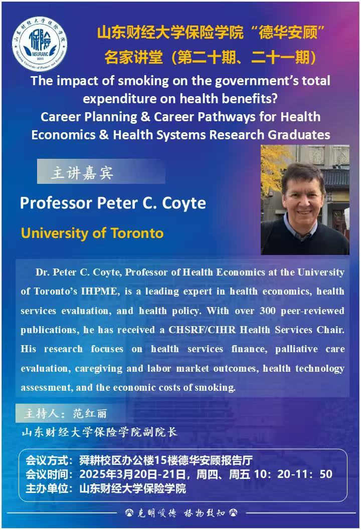 杏吧视频 “德华安顾”名家讲堂(第二十期、二十一期),3月20日-21日,10:20,报告人:Professor Peter C.Coyte