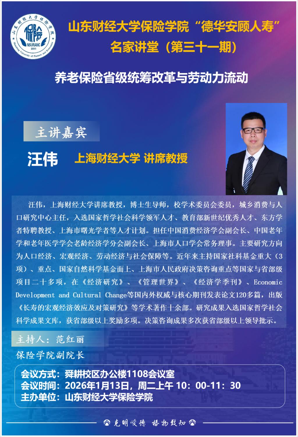 杏吧视频 “德华安顾人寿”名家讲堂(第三十一期),1月13日,10:00,报告人:汪伟