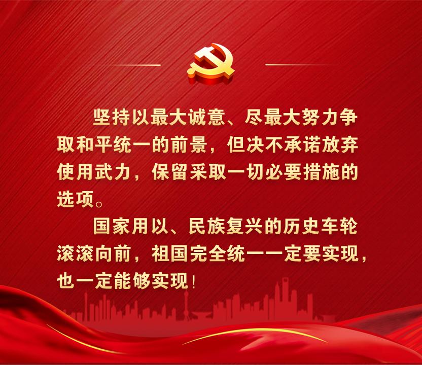 “一国两制”是中国特色社会主义的伟大创举,是香港、澳门回归后保持长期繁荣稳定的最佳制度安排,必须长期坚持。解决台湾问题、实现祖国完全统一,是党矢志不渝的历史任务,是全体中华儿女的共同愿望,是实现中华民族伟大复兴的必然要求。坚持贯彻新时代党解决台湾问题的总体方略,牢牢把握两岸关系主导权和主动权,坚定不移推进祖国统一大业。
