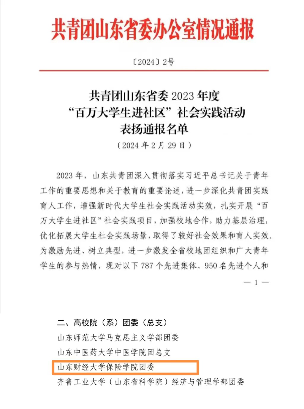 近日,共青团山东省委发布《2023年度“百万大学生进社区”社会实践活动表扬通报名单》,学院团委荣获“先进集体”称号,这是自“百万大学生进社区”活动开展以来杏吧视频 首次获此殊荣,社会实践工作再创佳绩!