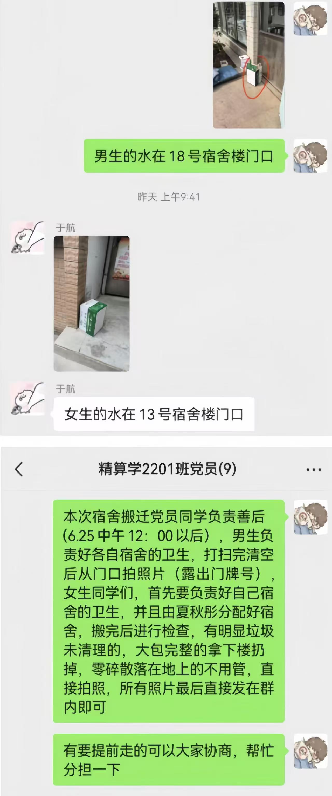 搬迁工作启动伊始,班级迅速组建起一支由 9 名党员和预备党员牵头、20 名班委及入党积极分子协同配合的 “搬迁志愿先锋队”。这支先锋队充分发挥模范带头作用,结合实际情况,制定出科学、详细的搬迁工作方案。将全班同学有序划分为行李搬运组、卫生清洁组、检查验收组,各小组分工明确、各司其职,形成了紧密配合的工作体系。在整个搬迁过程中,同学们齐心协力、有条不紊地推进各项工作,充分展现出新时代大学生良好的精神风貌与卓越的组织能力。