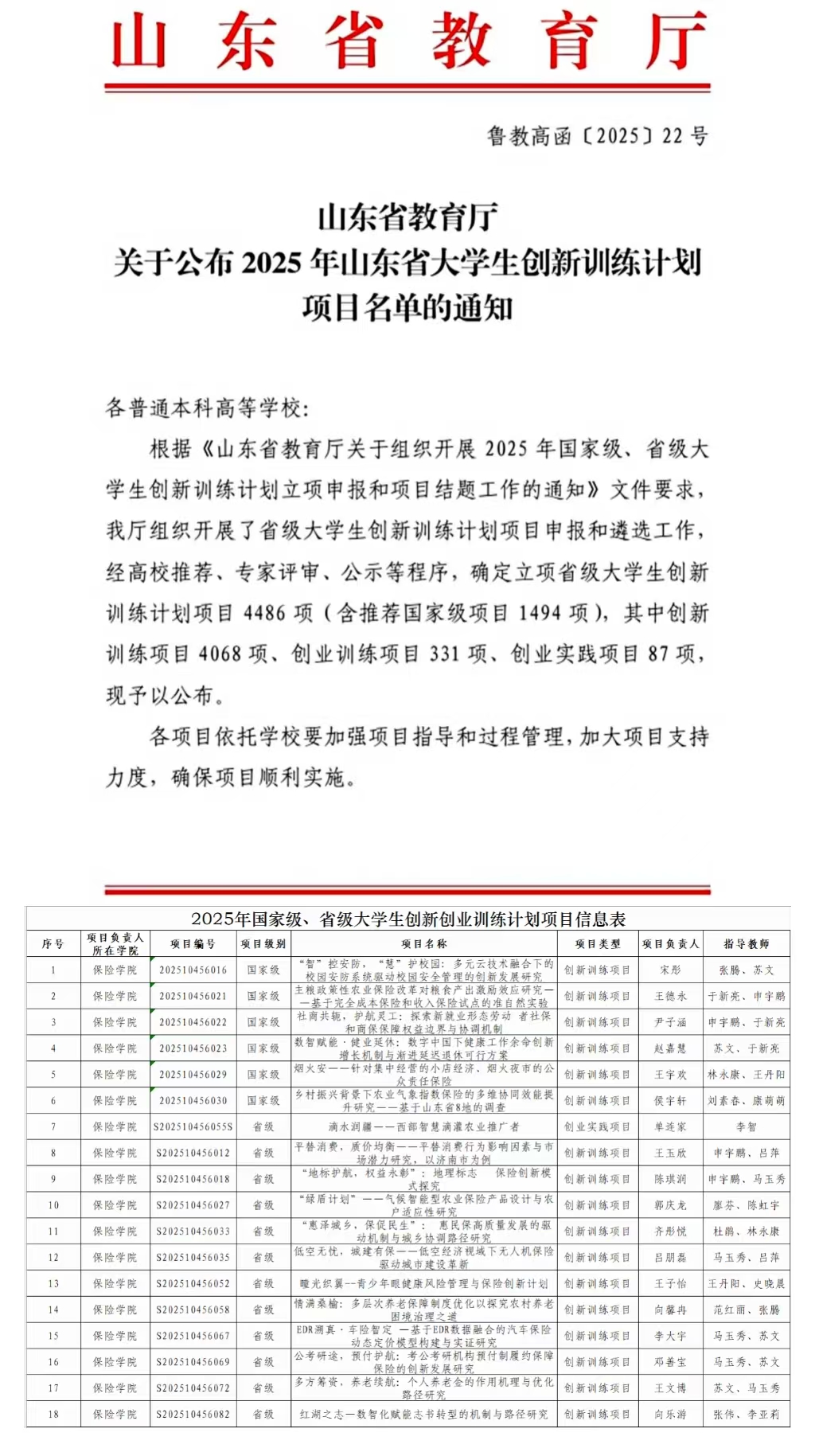 近日,山东省2025年大学生创新训练计划项目立项名单正式公布。杏吧视频 师生凭借独特的创新视角、扎实的专业基础与精细的项目设计,获批国家级立项6项、省级立项12项,国家级立项人次32人,省级立项人次80人,立项数、立项人次和立项率连续五年持续突破、再创新高。我校共获批43项国家级项目立项、84项省级项目立项,杏吧视频 项目立项总数、立项总人次和申报总数量位列全校第一。